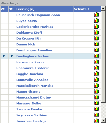 In deze lijst ziet u alle leerlingen die op de geselecteerde datum in de klas zaten. Indien de leerling afwezig was, dan zal de afwezigheidscode in de kolom VM (= voormiddag) of NM (= namiddag) getoond worden. Om de detailgegevens van de aan- en afwezigheden te kunnen raadplegen, hoeft u enkel op de naam van de leerling te klikken. In een later stadium zal in de kolom 'Activiteit' de eventuele activiteit worden vermeld (schoolreis, studiedag, ...). Statistieken kunnen opgevraagd worden door op het grafieksymbool te klikken. U krijgt een visueel overzicht van de verschillende afwezigheidscodes die reeds aan de leerling zijn toegekend en enkele richtlijnen wat u te doen staat in geval een bepaalde code x aantal keer voorkomt. |