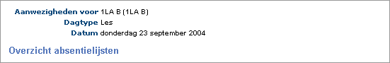 en welke datum wordt de absentielijst getoond en wat is het dagtype (les, geen