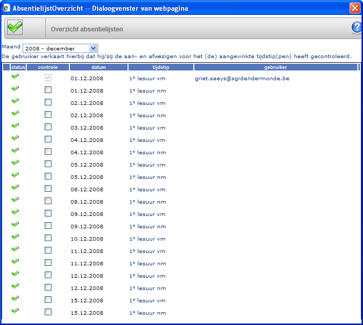Indien er geen absentielijst wordt getoond kunt u hier controleren of de absentielijst voor die dag wel werd aangemaakt (kolom 'status'). In dit scherm kan ook aangevinkt worden of de afwezigheden van een bepaalde dag werden ingevoerd. Het kan immers gebeuren dat geen enkele leerling afwezig was op een bepaalde dag. In dergelijk geval kan er twijfel rijzen of het register wel werd ingevuld. Als het veld "controle" wordt aangevinkt, wordt de gebruikersnaam ingevuld van degene die het register heeft gecontroleerd en is het ook duidelijk voor de andere gebruikers dat de afwezigheden van die dag werden ingevoerd. |