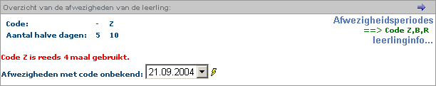 U zult merken dat code Z niet voorkomt in de lijst met aangeboden codes. Dit heeft natuurlijk een reden: de controle op het aantal periodes Z wordt hierdoor stukken eenvoudiger. De ziekteperiodes geeft u in via de knop 'Afwezigheidsperiodes'.